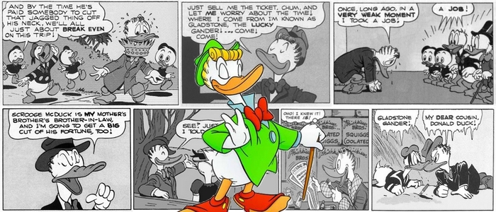 Ο τελευταίος, μάλιστα, τυχαίνει να είναι ιδιαίτερα ευκολόπιστος, με αποτέλεσμα να παρασύρεται από τον αστραφτερό μύθο του «επιτυχημένου εξάδελφου» και να κάνει το λάθος να θεωρεί τον Γκαστόνε πρότυπο για την προσωπική του ευτυχία. Στις σπάνιες περιπτώσεις που ο Γκαστόνε υποτροπιάζει, ο Ντόναλντ μεταμορφώνεται σε ένα ανόητα αισιόδοξο, θρασύτατο και αυτάρεσκο παπί. Για να εξισορροπήσει τον ζυγό της τύχης που τον αδικεί καταφανώς και για πολύ καιρό, υιοθετεί ανορθόδοξες μεθόδους, για να φτάσει τελικά να θρέψει τους καρπούς της ίδιας του της συντριβής. Μπορεί, λοιπόν, ο Γκαστόνε να καυχιέται για την τύχη και για τα ηρωικά του κατορθώματα, όμως, τελικά, εκείνος που αγωνίζεται να γίνει ήρωας δεν είναι άλλος από τον Ντόναλντ!