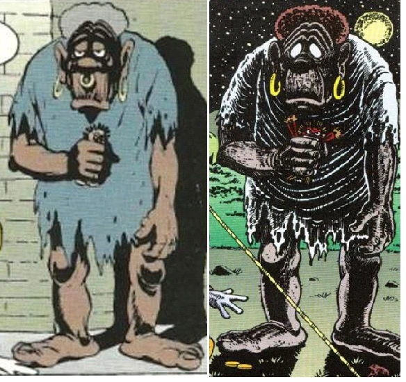 Ο Μπόμπυ όπως τον σχεδίασε ο Μπαρκς (αριστερά) και ο Ρόσα (δεξιά). Η εκδοχή του Ρόσα είναι όπως την είχε οραματιστεί αρχικά ο Μπαρκς, χωρίς κόρες στα μάτια.