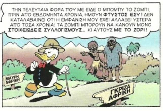 Οι Αφρικανοί όμως είναι πιο γρήγοροι και τους πλησιάζουν επικίνδυνα, ώσπου τα παπιά καθώς αναρριχώνται βρίσκουν τον Μπόμπυ, που έχει χαθεί. Ο Ντόναλντ του δένει τις πλάκες από καουτσούκ στα πόδια και στέλνει το ανέκφραστο ον στην κατηφόρα. Το ζόμπι πέφτει πάνω στους ντόπιους, σταματώντας τους και επιτρέποντας στους κυνηγημένους να διαφύγουν.