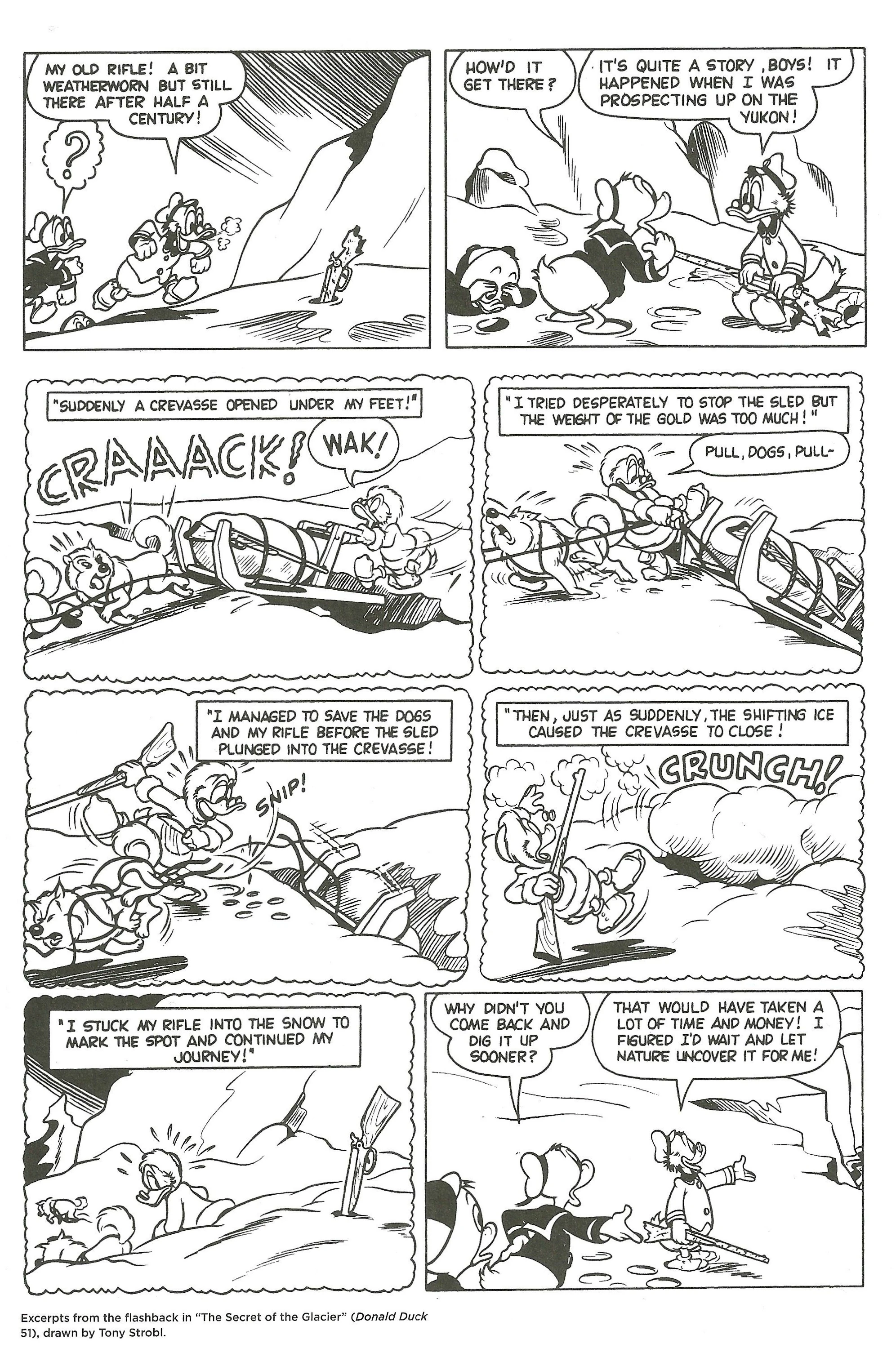 Πίσω στο παρόν, ο Ντόναλντ και τα ανίψια του έχουν φτάσει στο θησαυροφυλάκιο και διαβάζουν το γράμμα που έχει λάβει ο Σκρουτζ από την τράπεζα, το οποίο αναφέρει πως το σημάδι που είχε βάλει στον παγετώνα, έχει πλησιάσει επικίνδυνα στον ποταμό, όπου δηλαδή θα απελευθερωθεί αυτό που έχασε. Ο μεγιστάνας μόλις το διαβάζει, αμέσως παίρνει τα ανίψια του και ξεκινούν για το Ουάιτχορς.