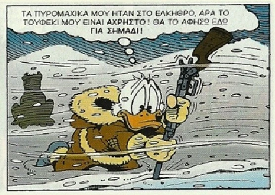 Ο Σκρουτζ βάζει ως σημάδι το τουφέκι του, στον παγετώνα...