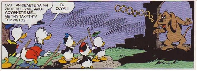 Οι Χιούη, Λιούη και Ντιούη αποφασίζουν πως πρέπει να το πολεμήσουν, με ματσούκια, παρά την δειλία των θείων τους, όταν εμφανίζεται το τέρας. Το πελώριο ον επιτίθεται στους Λιμνουπολίτες και τους τρέπει σε φυγή, μακριά από το κάστρο, αλλά πάνω στην καταδίωξη το θηρίο πέφτει στην τρύπα που είχε πέσει και ο κροίσος.