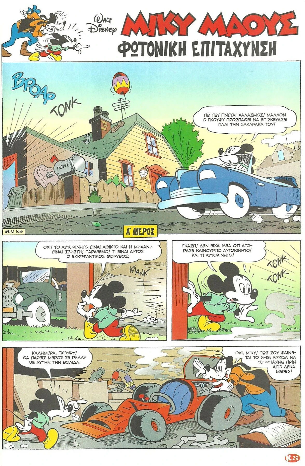 Ο Γκούφυ ξεκινάει να κάνει μια δοκιμαστική βόλτα, μόλις όμως ενεργοποιεί τον σιγαστήρα το αγωνιστικό βγαίνει εκτός ελέγχου και τρακάρει. Ο Μίκυ αποφασίζει να πάρει τηλέφωνο την εταιρεία που έχει φτιάξει το εξάρτημα, ώστε ο φίλος του να πάρει τα λεφτά του πίσω.