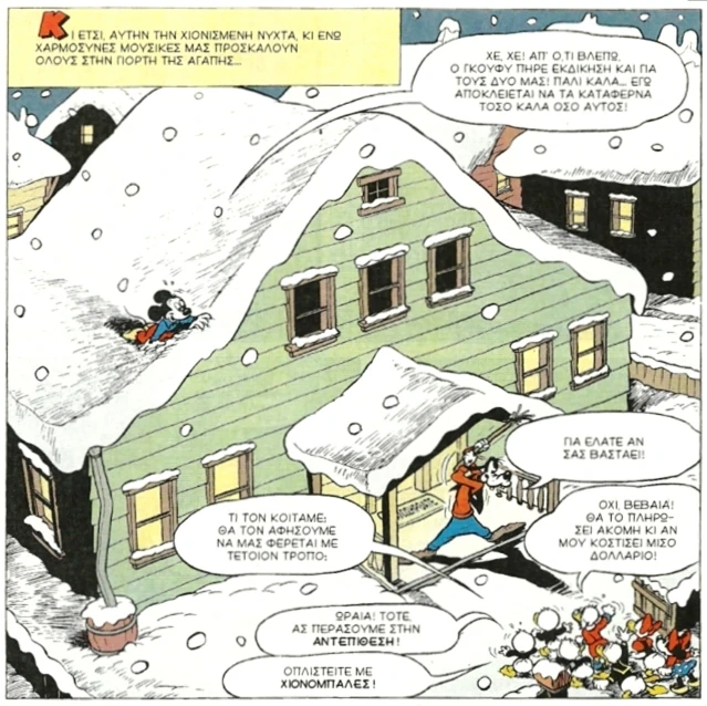 Αρχίζει κατόπιν να μοιράζει ξυλιές με τους επισκέπτες να μην μπορούν να καταλάβουν τι συμβαίνει και να βγαίνουν από το σπίτι για να σωθούν. Στον κήπο οπλίζονται όλοι με χιονόμπαλες τις οποίες πετάνε ασταμάτητα στον Γκούφυ, που υποχωρεί στο σπίτι, όπου συναντάει τον Μίκυ, που του λέει πως είναι πια ορατοί.