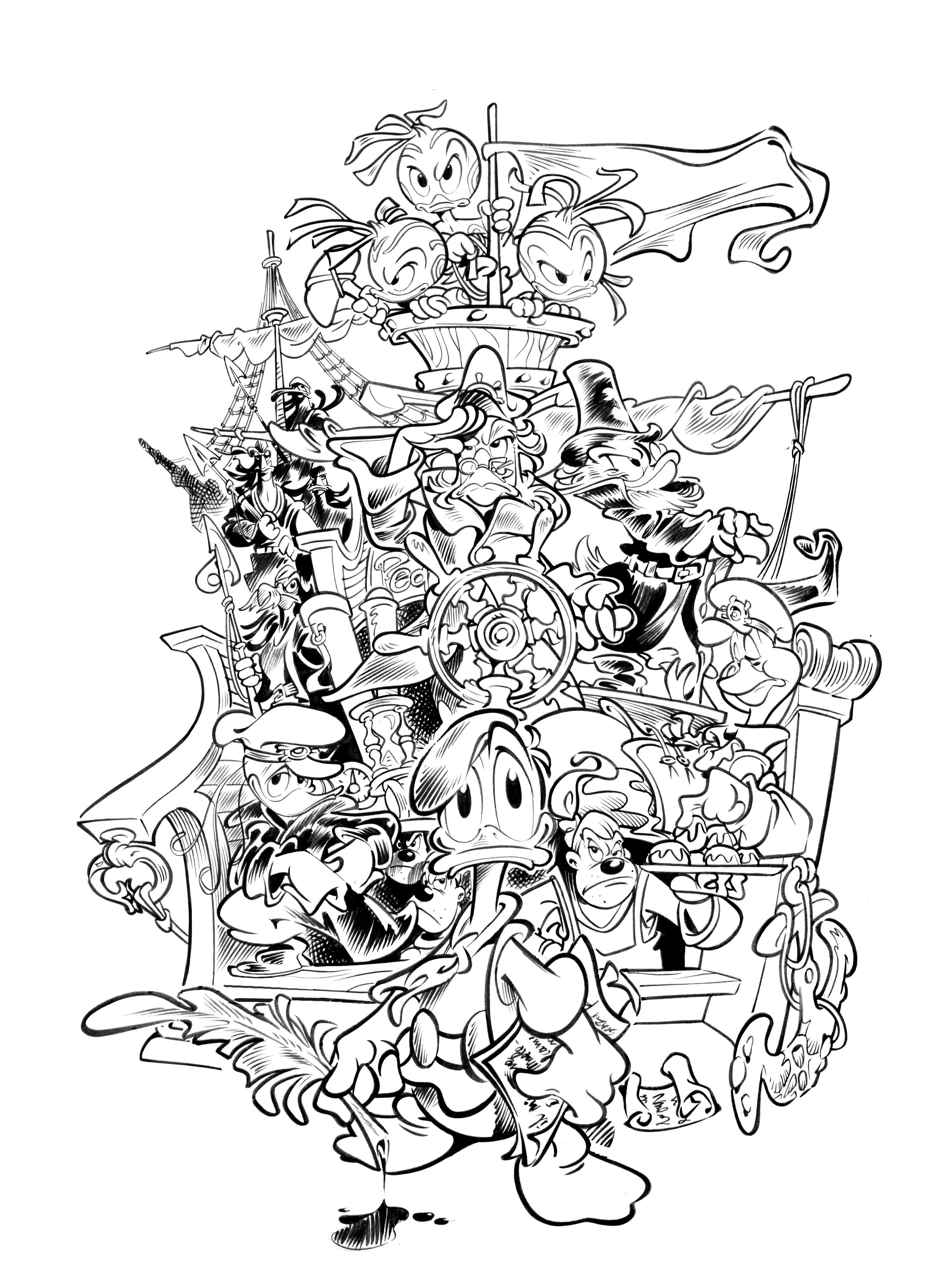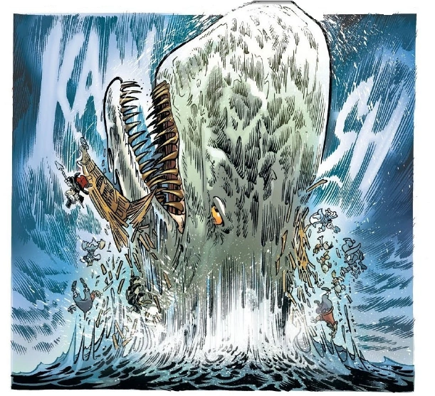 Ο Μόμπυ Ντικ καταστρέφει το πλοίο του Άχαμπ και καταπίνει τους θησαυρούς του αλλά και αυτό που μετράει περισσότερο για τον Άχαμπ, το σεντούκι του με την πρώτη του δεκάρα, το σύμβολο της δύναμης και καλής τύχης του! Από το τότε ο Άχαμπ του κυνηγάει θανάσιμα για πάρει πίσω αυτό που έχασε! Στην ιστορία η τελική μάχη έχει μια εντελώς διαφορετική κατάληξη απ' το μυθιστόρημα! Τον καπετάνιο Άχαμπ, τον Ισμαήλ και τα άλλα μέλη του πληρώματος εκτός από τον Στουμπ. Σταρκμπακ και Φλατς τους καταπίνει η λευκή φάλαινα. Στο εσωτερικό αυτού του τεράστιου κητοειδούς οι Καμακιστές και η Φεντάλλα αποκαλύπτουν τον πραγματικό τους σκοπό! Να πλουτίσουν, αλλά ηττήθηκαν με ευκολία και στο τέλος το πλήρωμα καταφέρνει να αποδράσει ανάβοντας φωτιά μέσα στην κοιλιά της φάλαινας ώστε να αναγκαστεί να τους φτύσει έξω. Μετά από αυτό ο Μόμπυ Ντικ φεύγει και πάλι στη θάλασσα με τον Άχαμπ να αναρωτιέται τι να ψάχνει.