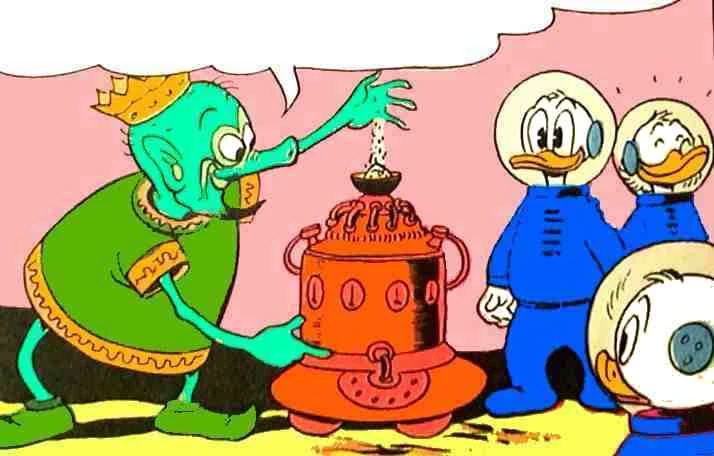 το διαπλανητικό ταξίδι οδηγεί σε μια κωμικά ορθολογική ερμηνεία της παγκόσμιας μυθολογίας. Στις ιστορίες The Twenty- Four Carat Moon (Το Ολόχρυσο Φεγγάρι, ΚΟΜΙΞ 32) και The Loony Lunar Gold Rush (Χρυσός Σεληνιασμός, ΚΟΜΙΞ 54), το αύριο μοιάζει να είναι επανάληψη του χθες. Αυτό αποδεικνύεται από το ότι ο φιλόδοξος γελαδάρης στο Ολόχρυσο Φεγγάρι ξεκινάει να κατακτήσει το διάστημα με έναν πύραυλο καουμπόικης αισθητικής, ενώ στον Χρυσό Σεληνιασμό σκηνές που θα φάνταζαν φυσιολογικές σε ένα σαλούν της Άγριας Δύσης, φαντάζουν αλλόκοτες γιατί διαδραματίζονται στην Σελήνη, με πρωταγωνιστές που φοράνε σκάφανδρα.